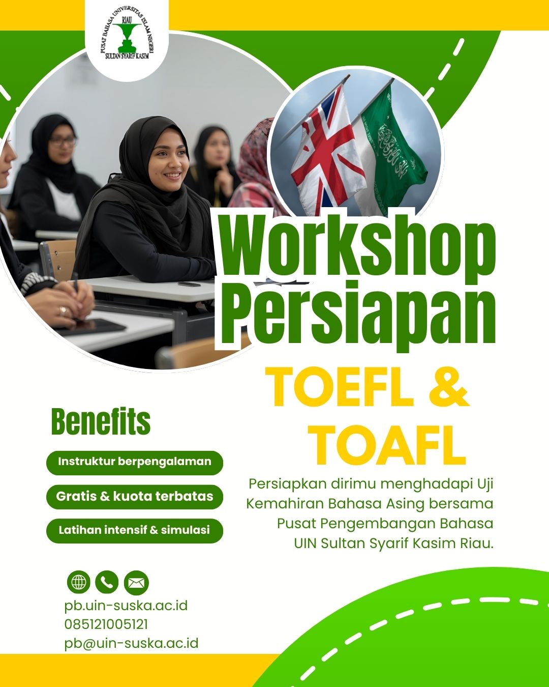 Dalam rangka meningkatkan kompetensi mahasiswa dalam menghadapi tes bahasa asing (bahasa Inggris dan bahasa Arab), serta mendukung pencapaian visi internasionalisasi, Pusat Pengembangan Bahasa UIN Sultan Syarif Kasim Riau akan menyelenggarakan Workshop Persiapan TOEFL dan TOAFL khusus bagi mahasiswa aktif.
